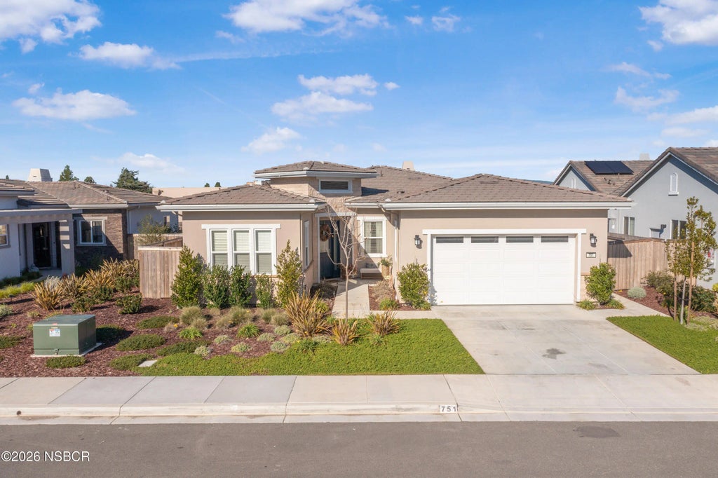 Welcome to 751 Skyview Lane, a place where comfort, design, and everyday ease come together in one of Santa Maria's most desirable neighborhoods. Tucked within Skyview Estates by Coastal Community Builders, this home is part of an intimate community of just 57 thoughtfully designed residences, where peaceful streets, a private neighborhood park, and beautifully maintained common areas create a true sense of belonging.As you step inside, you're greeted by soaring ceilings and natural light that instantly make the home feel open and inviting. The heart of the home is a stunning kitchen, finished with quartz countertops, a gorgeous designer backsplash, and modern functionality that flows seamlessly into the living and dining spaces perfect for both quiet evenings and lively gatherings. Energy efficiency comes built in with paid-for solar panels, while thoughtful upgrades like a water softener system add everyday comfort.With four bedrooms and three bathrooms, the layout offers flexibility for families, guests, or a home office. The primary suite is a true retreat, featuring a relaxing soaking tub, a private water closet, and a calm, spa-like atmosphere designed to help you unwind. An indoor laundry room adds convenience, and the home comes fully equipped with washer, dryer, stove, and refrigerator, making it move-in ready from day one.Outside, a sprinkler system keeps the landscaping effortlessly maintained, while the HOA-managed common areas ensure the neighborhood always looks its best. The setting is quiet and welcoming, yet ideally located near Vandenberg Space Force Base and with easy access to Highway 101, connecting you quickly to work, shopping, dining, and the Central Coast lifestyle.At 751 Skyview Lane, this isn't just a house it's a place to settle in, slow down, and truly feel at home. Opportunities like this in Skyview Estates are rare, and this one is not to be missed.